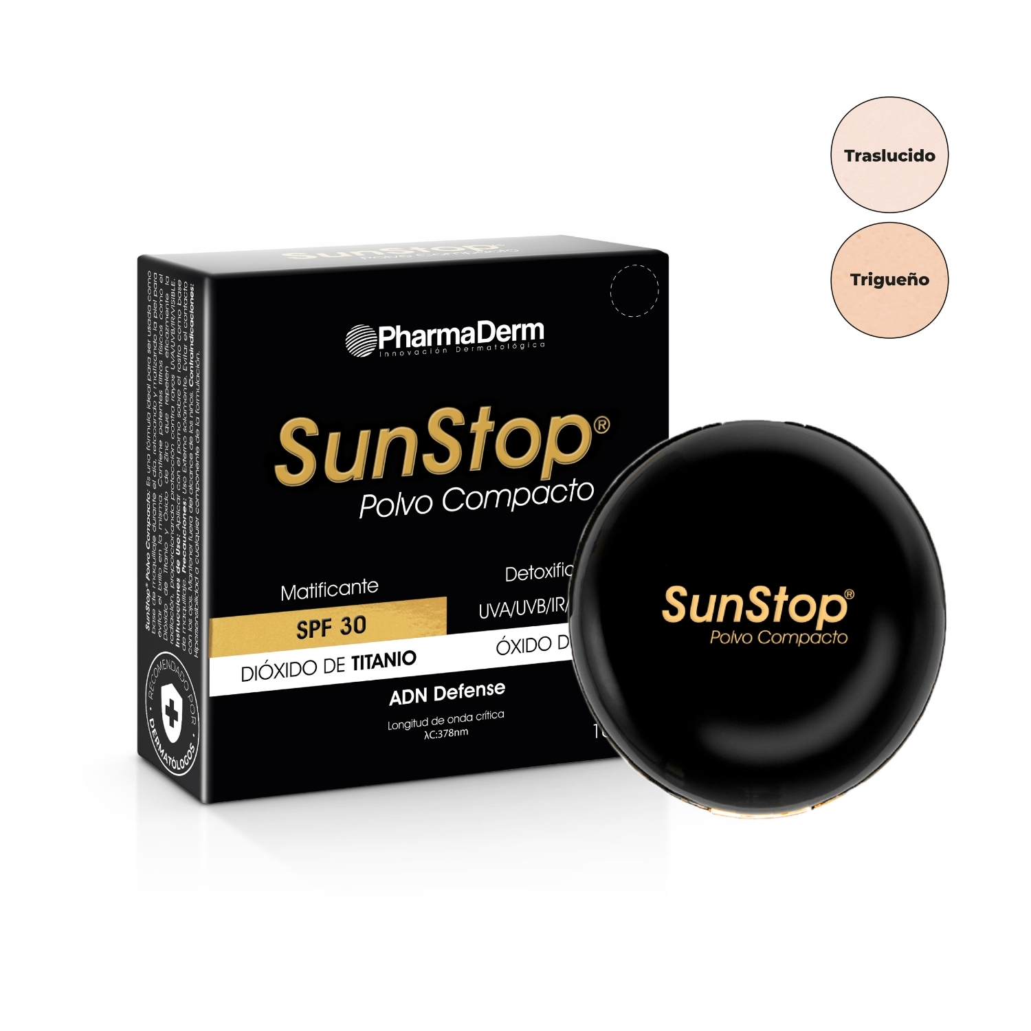 Fotoprotector en polvo compacto con una formula ideal para ser usada como base de maquillaje durante el dias, retocando y matizando la piel para evitar el brillo, contiene potentes filtros fisico como Dioxido de Titanio y Oxido de zinc que refleja eficazmente la radiacion solar, proporcionando proteccion ante los rayos UVA / UVB / IR y LUZ AZUL. Disponible en 2 tonos traslucido y trigueño.
